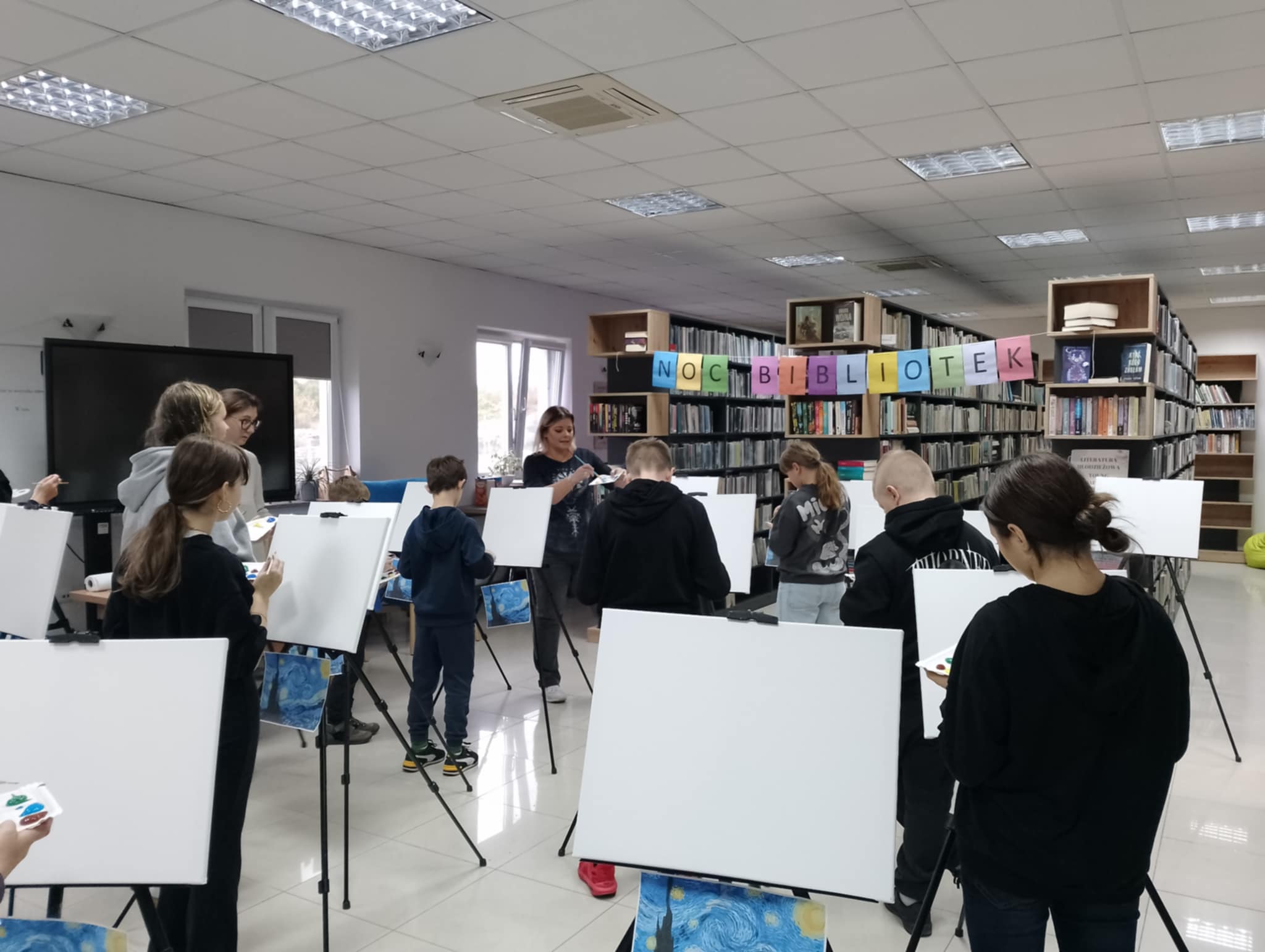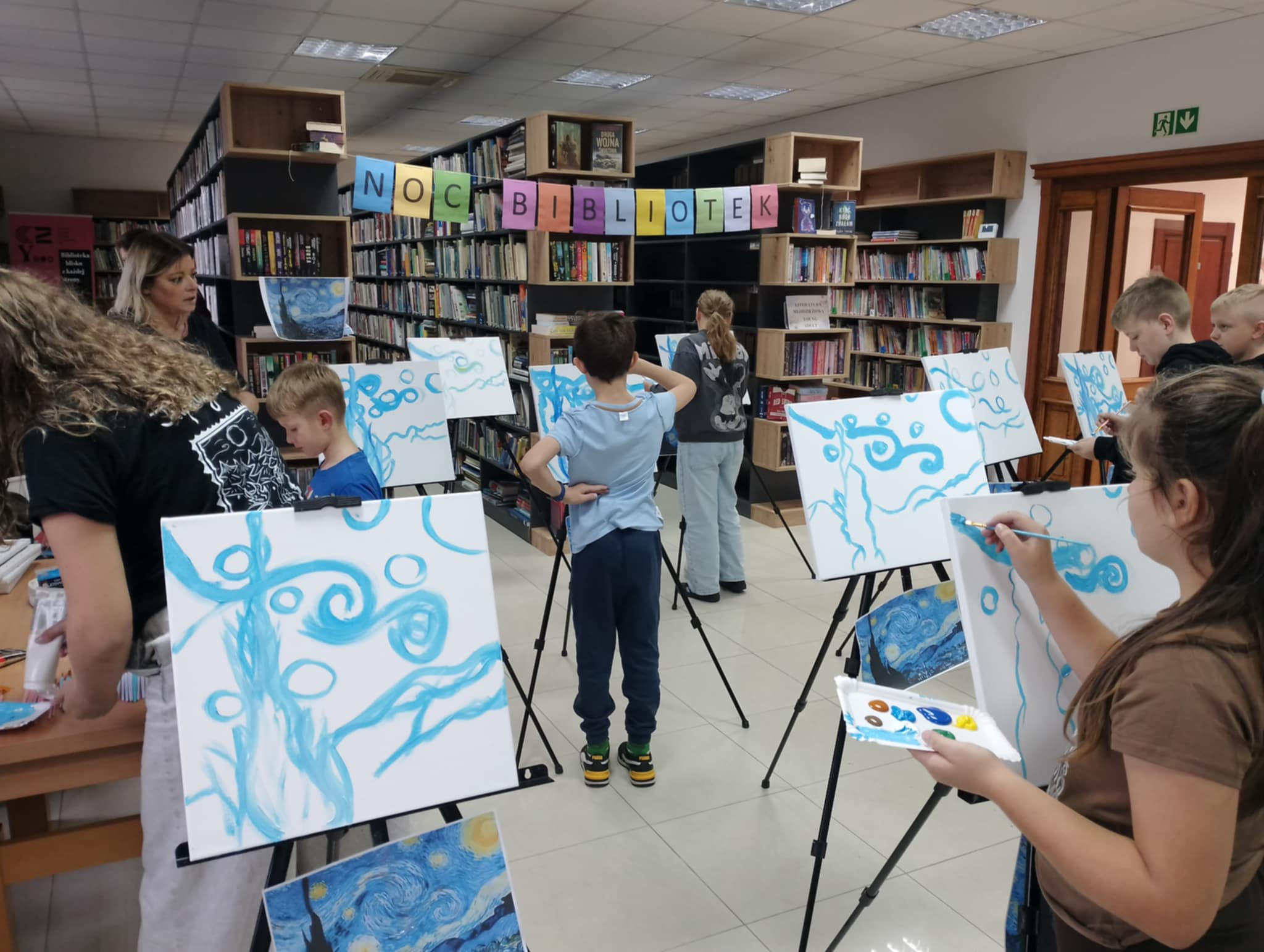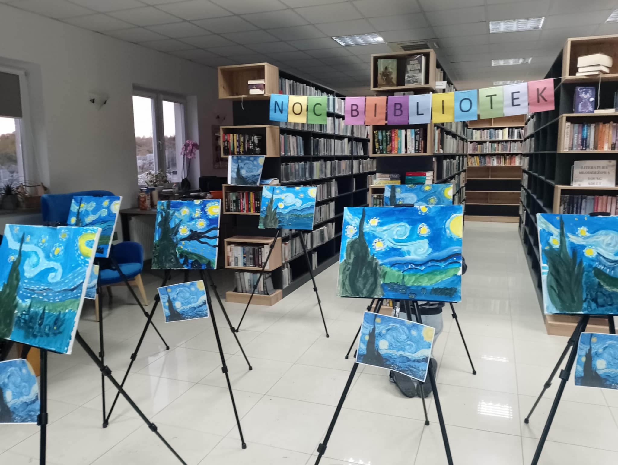Tegoroczne hasło DO DZIEŁA zainspirowało nas do artystycznych zadań pod postacią Vincenta Van Gogha. Na początku spotkania młodzież biorąca udział w Nocy bibliotek zamieniła się w malarzy i razem z Panią Katarzyną stworzyli reprodukcje słynnej "Gwiaździstej Nocy" = co generowało bardzo duże skupienie i zaangażowanie wśród uczestników i uczestniczek.
