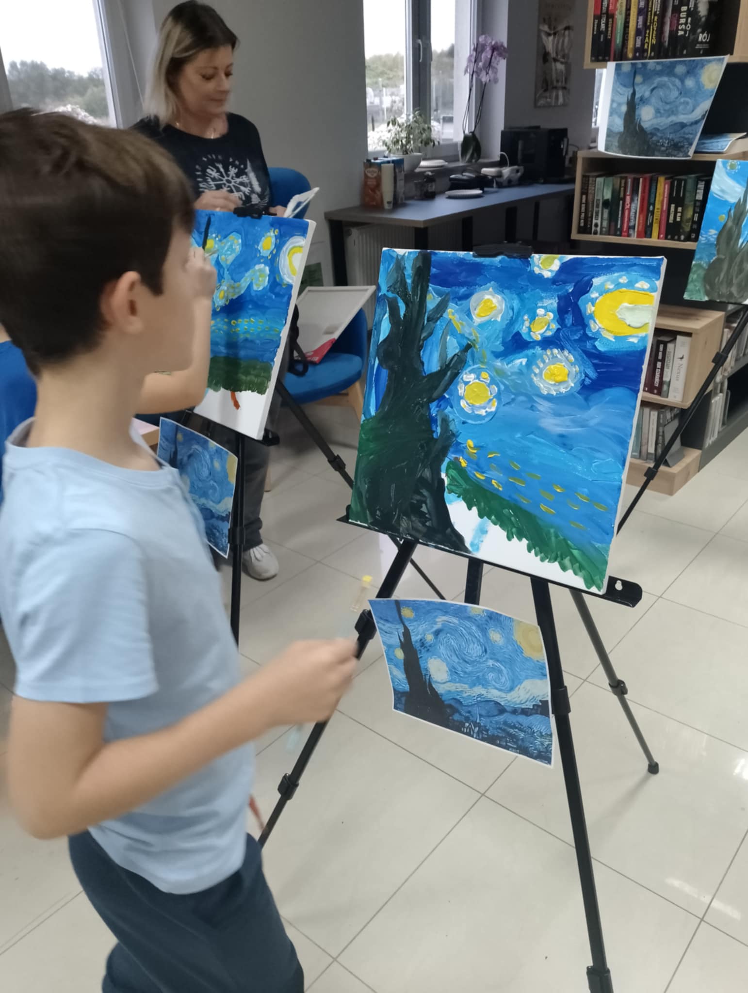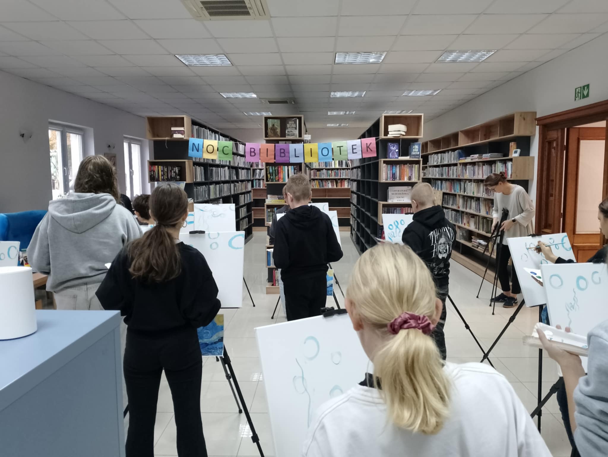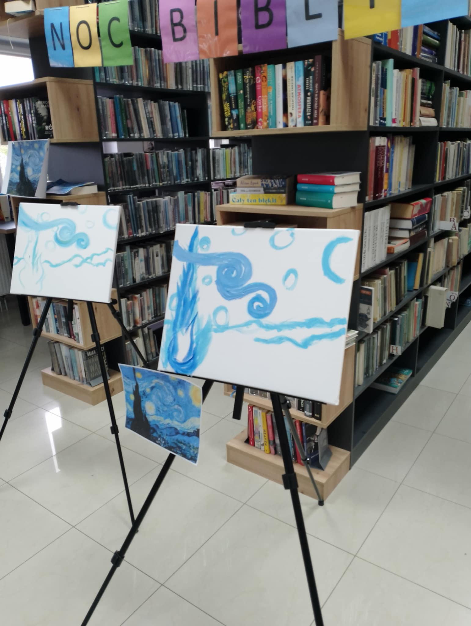 Tegoroczne hasło DO DZIEŁA zainspirowało nas do artystycznych zadań pod postacią Vincenta Van Gogha. Na początku spotkania młodzież biorąca udział w Nocy bibliotek zamieniła się w malarzy i razem z Panią Katarzyną stworzyli reprodukcje słynnej "Gwiaździstej Nocy" = co generowało bardzo duże skupienie i zaangażowanie wśród uczestników i uczestniczek.
